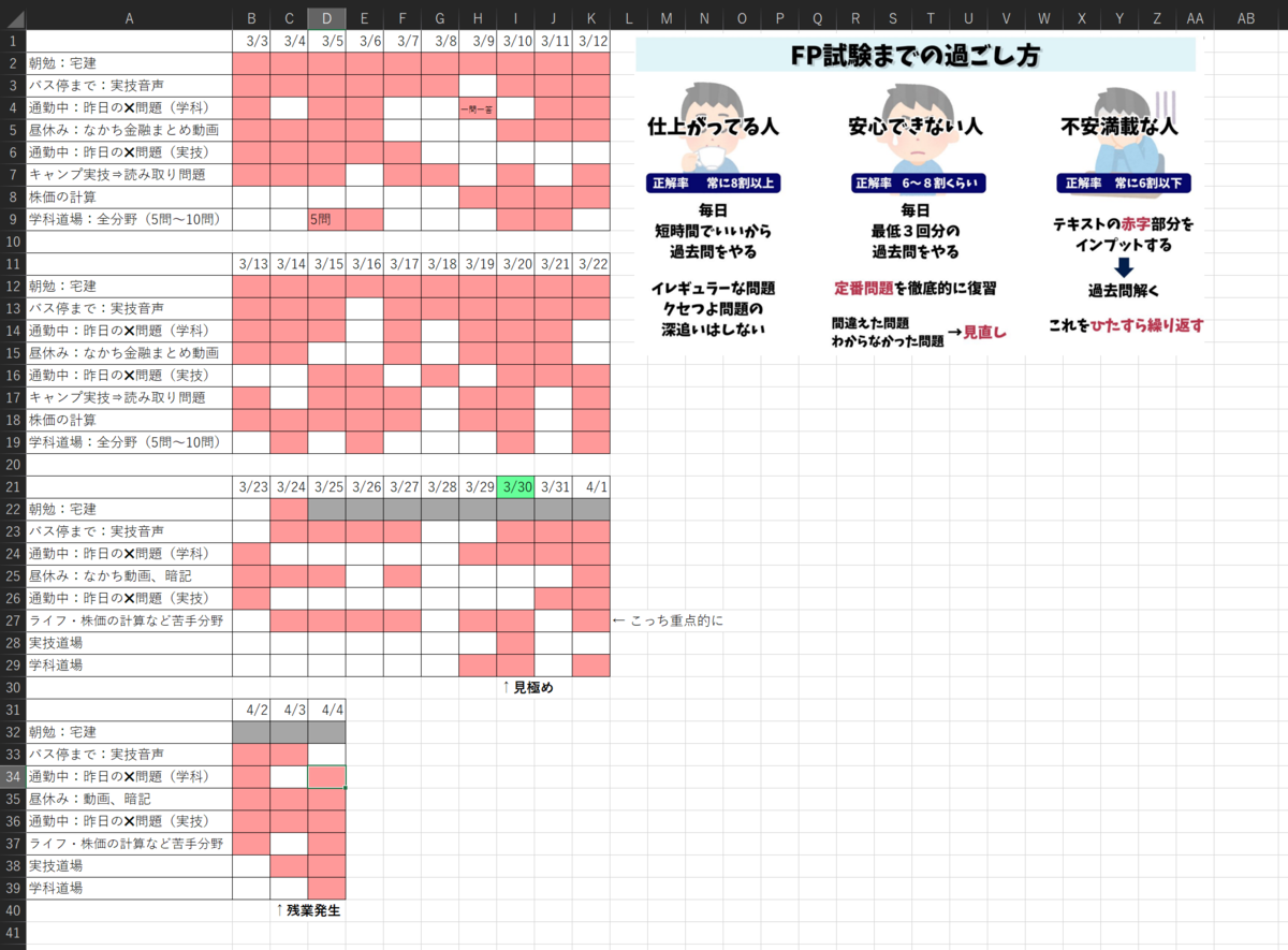 エクセル中に貼ってあるいらすとやさんの絵は、なかちさんの動画をスクショしたものなんですけど、毎日3回分の過去問やるって無理じゃね????私はできませんでしたㅠㅜ
