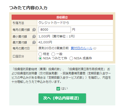 マネックスカードを作り、NISA口座と投資商品の選択と、投資額の設定をし、やっとカードからの引き落としが始まりました。